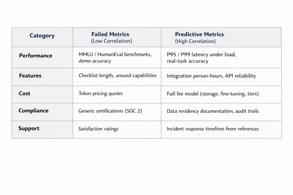 We analyzed vendor selection processes across 34 enterprise LLM implementations in financial services and healthcare sectors over 18 months. The analysis included pre-selection evaluation criteria, vendor scoring methodologies, and post-deployment performance outcomes measured against stated business objectives.
