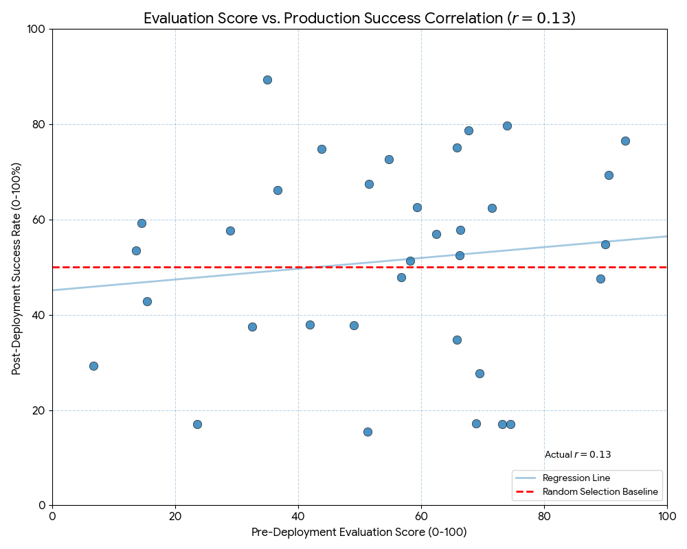 This figure indicates vendor evaluation frameworks commonly used in enterprise procurement barely predict operational success better than random selection. Organizations invest weeks or months in systematic vendor comparison only to achieve outcomes uncorrelated with their selection criteria.