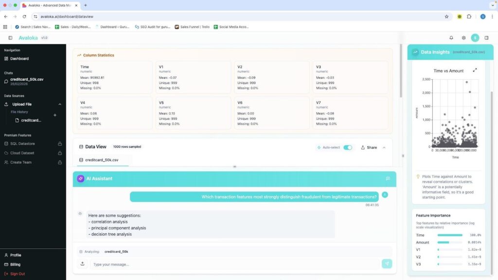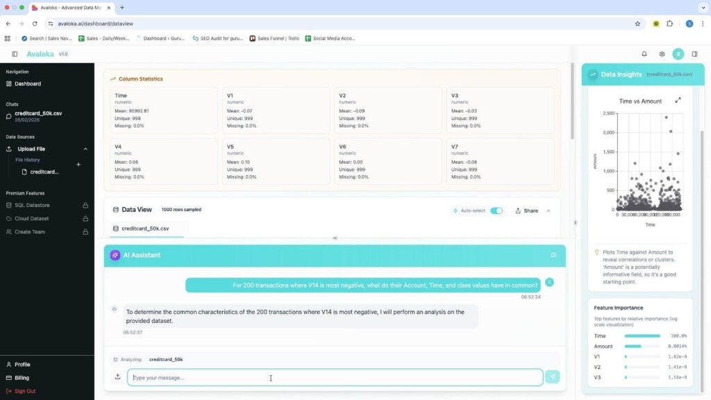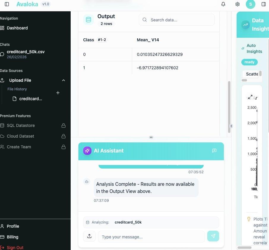 Upload the CSV. No configuration. No schema mapping. No setup time. No ETL drama. Within seconds AVALOKA surfaces the full column intelligence panel automatically  every column profiled, type detected, mean computed, missing value rate scanned. The Data Insights panel activates on the right: a Time vs Amount scatter plot generates, a Class Distribution chart appears, the Feature Importance sidebar begins computing. None of this required a single query.
